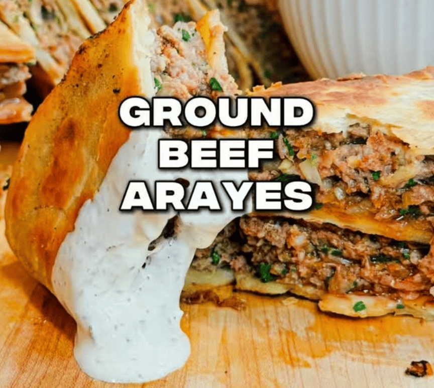 On deck: Ground Beef Arayes. Seasoned ground beef stuffed into tortillas or pitas, pan-crisped until golden, juicy on the inside, and finished with a creamy garlic sauce that pulls the whole thing together.